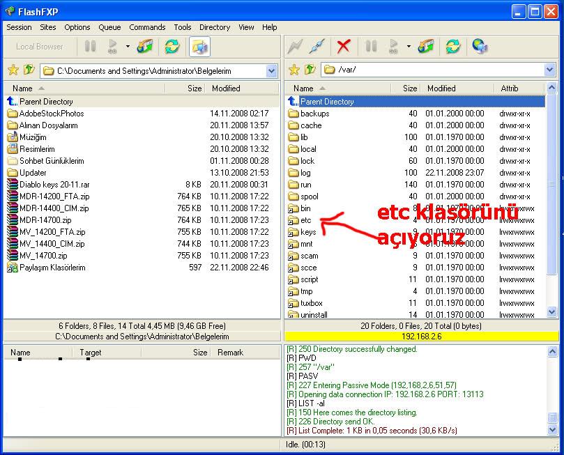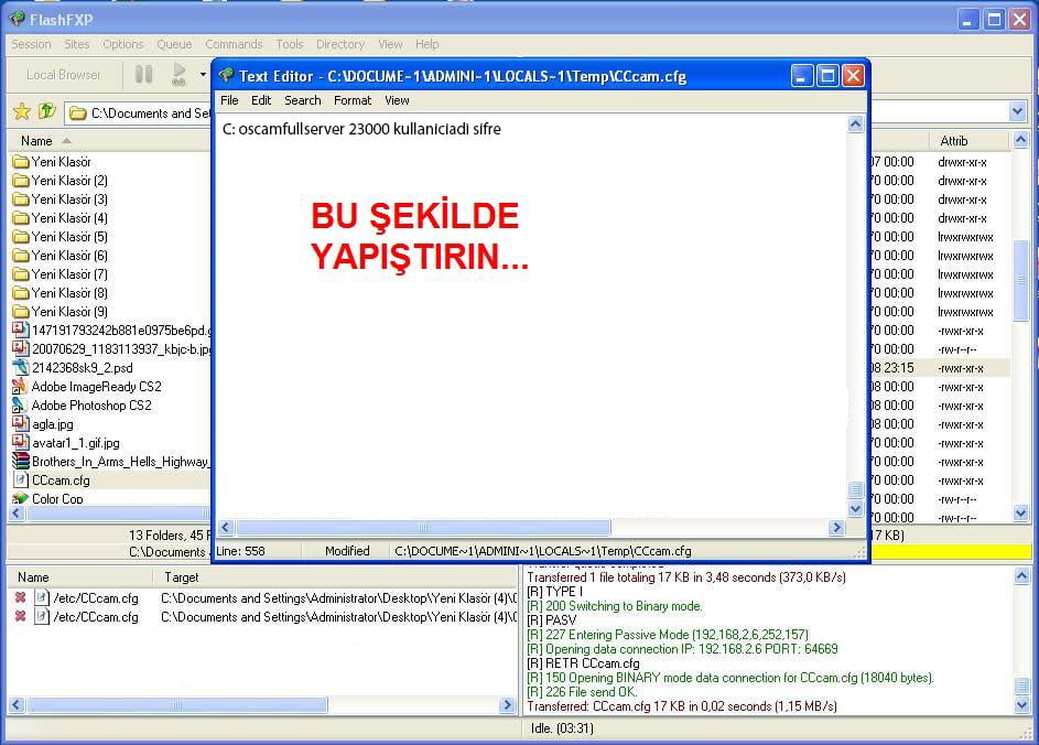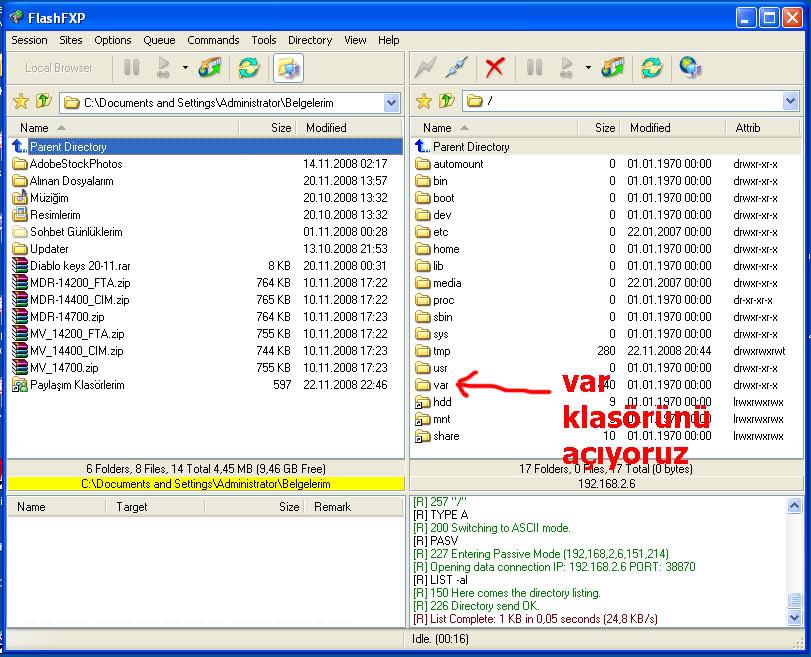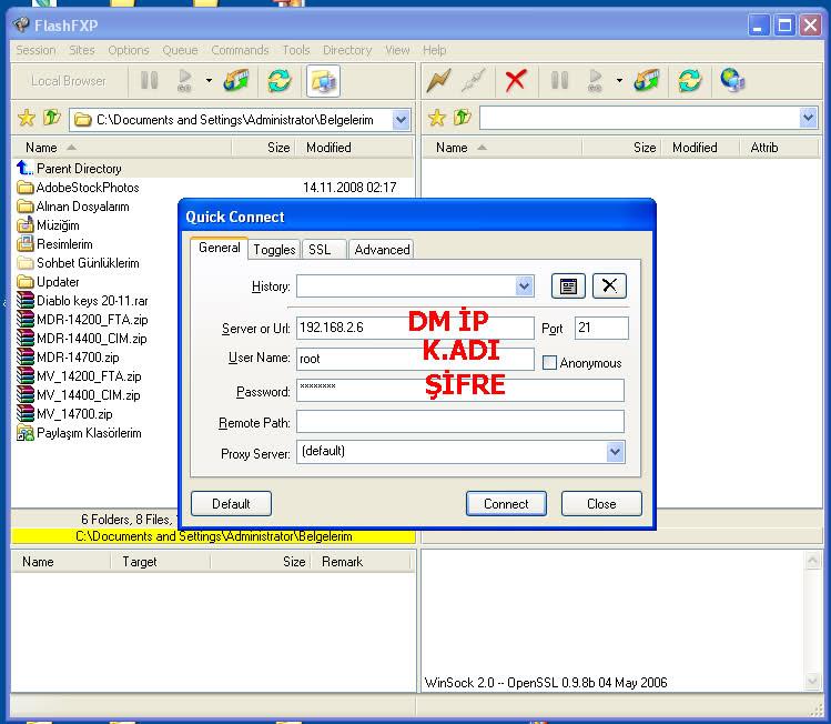 Bilgisayardan receivere bağlanıp kurulumu tamamlamamız için bilgisayarımıza flash fxp uygulamasını yüklüyoruz. Uygulama açıldıktan sonra flash fxp ekranında bizden istenen bilgiler var cihaza bağlanmak için bunları aşağıdaki gibi yapınız.